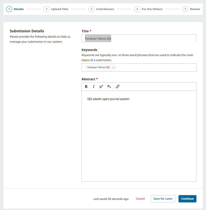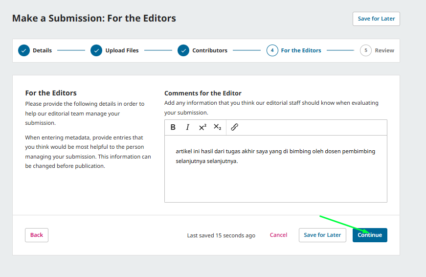 Bagian ini berfungsi untuk menyampaikan pesan atau informasi penting kepada tim editor jurnal. Meskipun, ini opsional, kolom ini sangat berguna jika kamu ingin memberi penjelasan tambahan terkait artikel yang kamu submit.