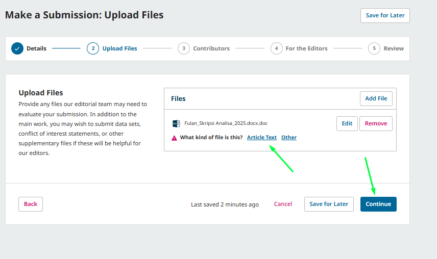 Pada bagian unggah file jurnal kamu (.docx atau .pdf), klik Add File > lalu pilih jenis jurnal yang kamu upload di bagian What kind of file is this? bisa pilih Article Text atau Others > Continue.