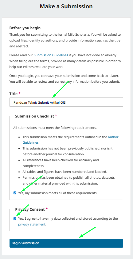 - Pada langkah ini, kamu diminta untuk mengisi jurdul artikel menyetujui syarat dan kebijakan jurnal dengan menyetujui checklist dan menyetujui izin penggunaan data. Penting untuk kamu membaca Submission Guidelines pada link biru yang tersedia. Kalau sudah klik Begin Submission.